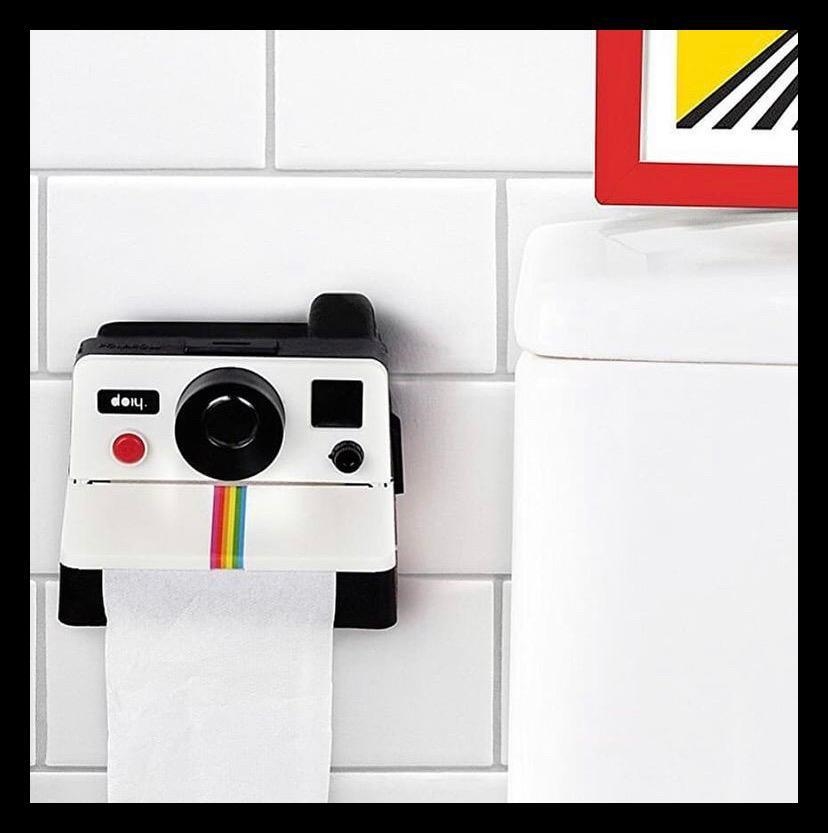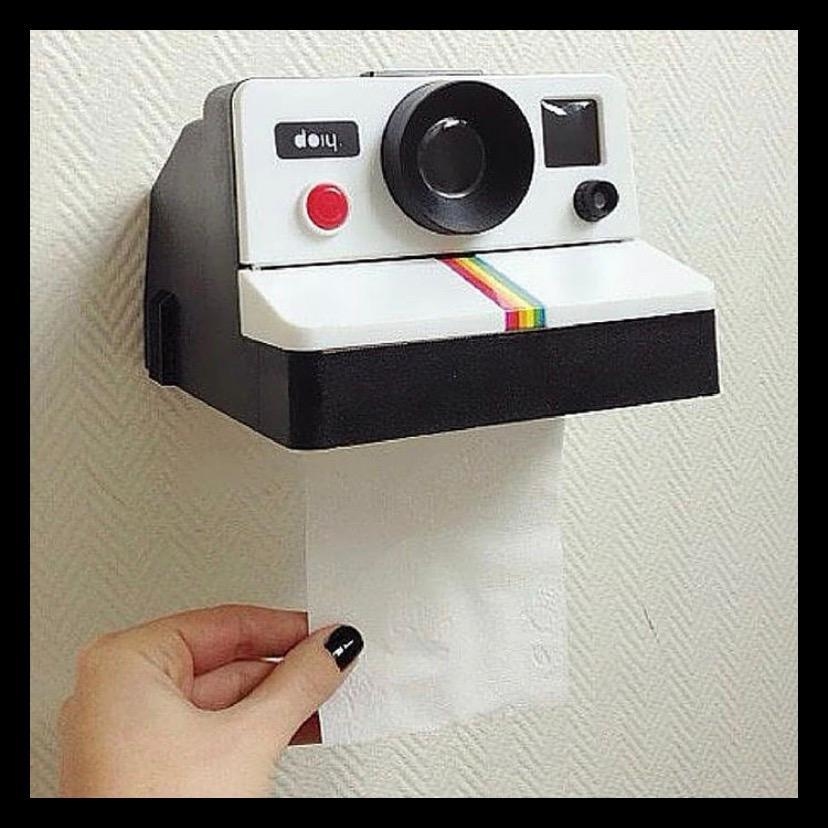 porta rollo en forma de camara polaroid, se engancha a la pared con tornillos, dimencoines: 15cm aprox.